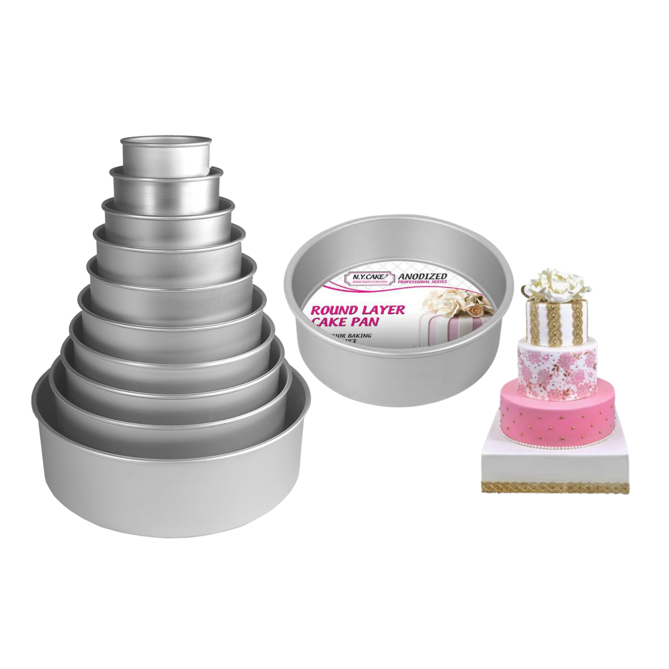 Round Layer Cake Pan (Anodized Aluminum) The NY CAKE line of professional cake pans have straight sides for perfectly stacked tiers every time. The...